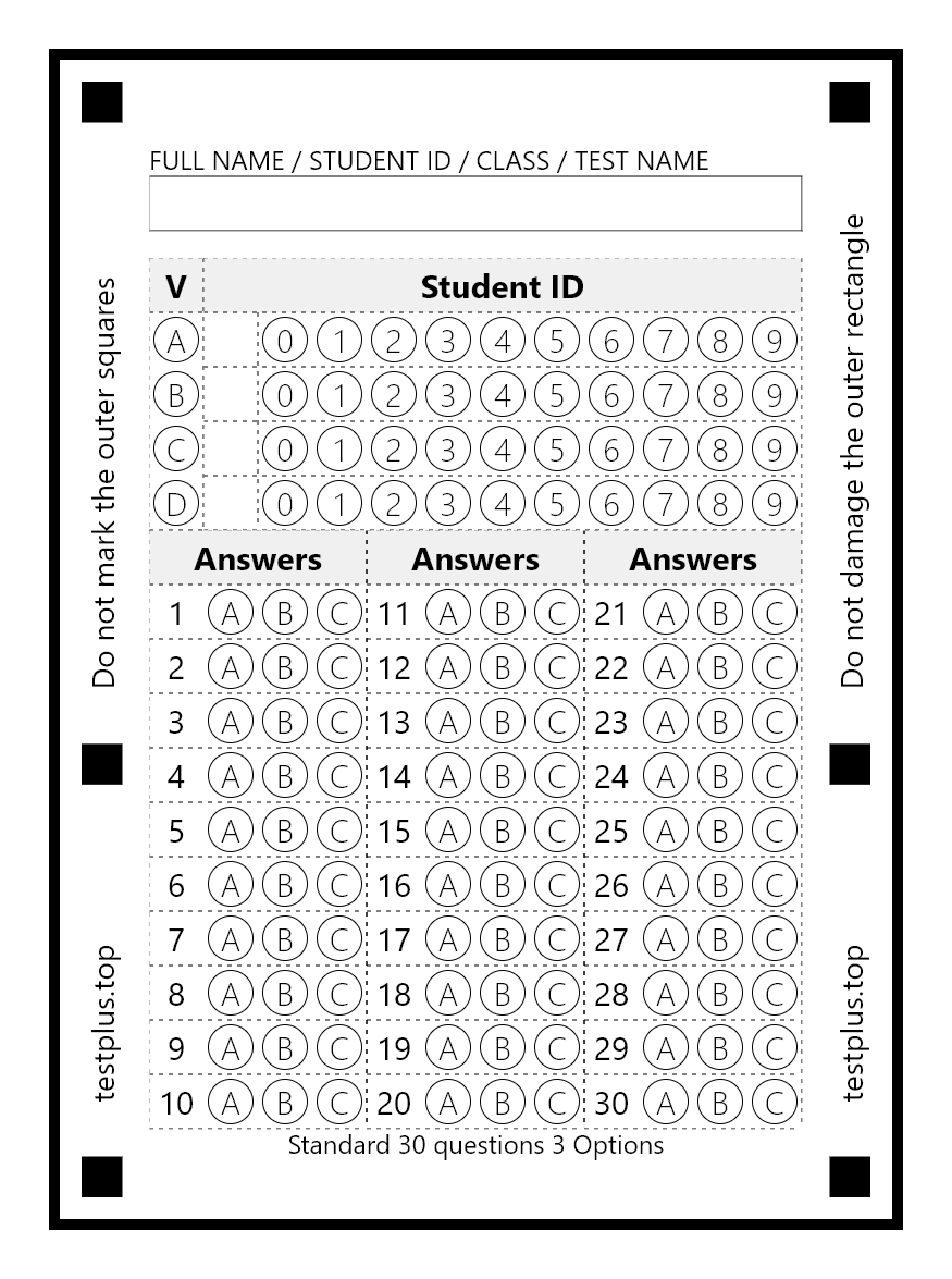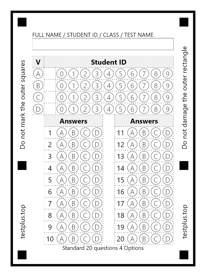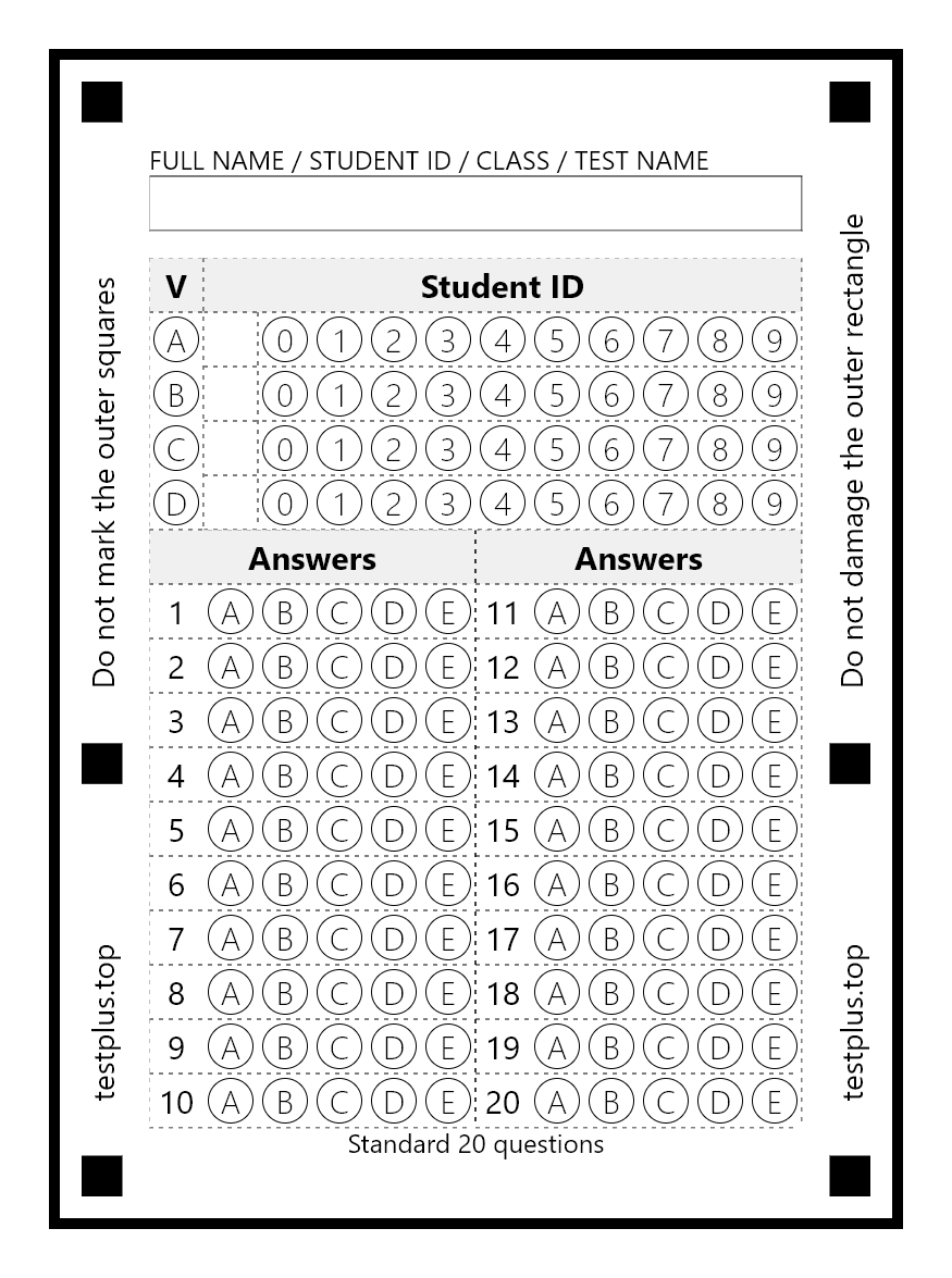 You can use ready-made optical forms or design your own. You can freely choose the marking patterns (ABCDE, ABCD, ABC, etc.). You can export and print optical forms in A4, A5, A6 and A7 formats. You can combine A5, A6 and A7 forms to print 2, 4 or 8 optical forms at once. You can scan the optical forms as images with a scanner, transfer them to your phone, and read all the papers at once.