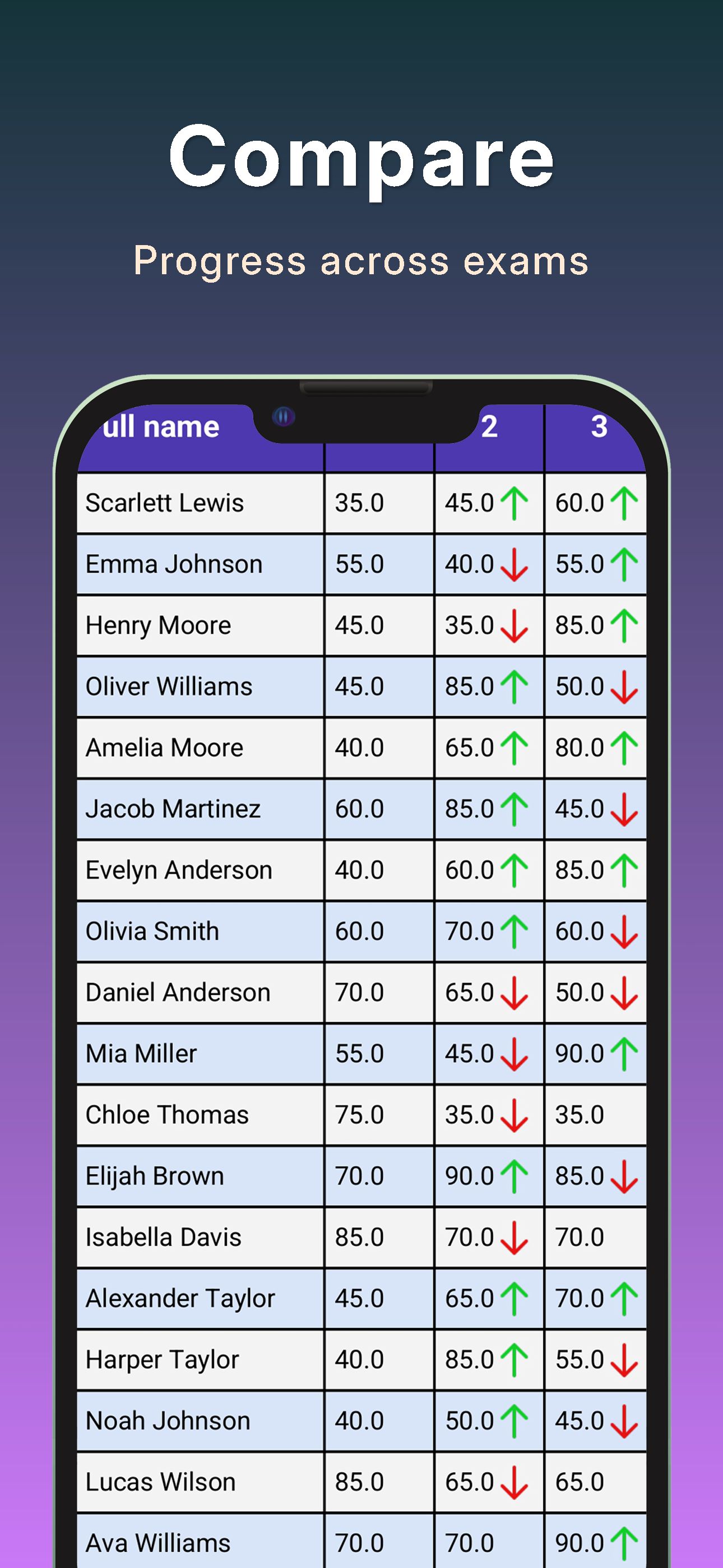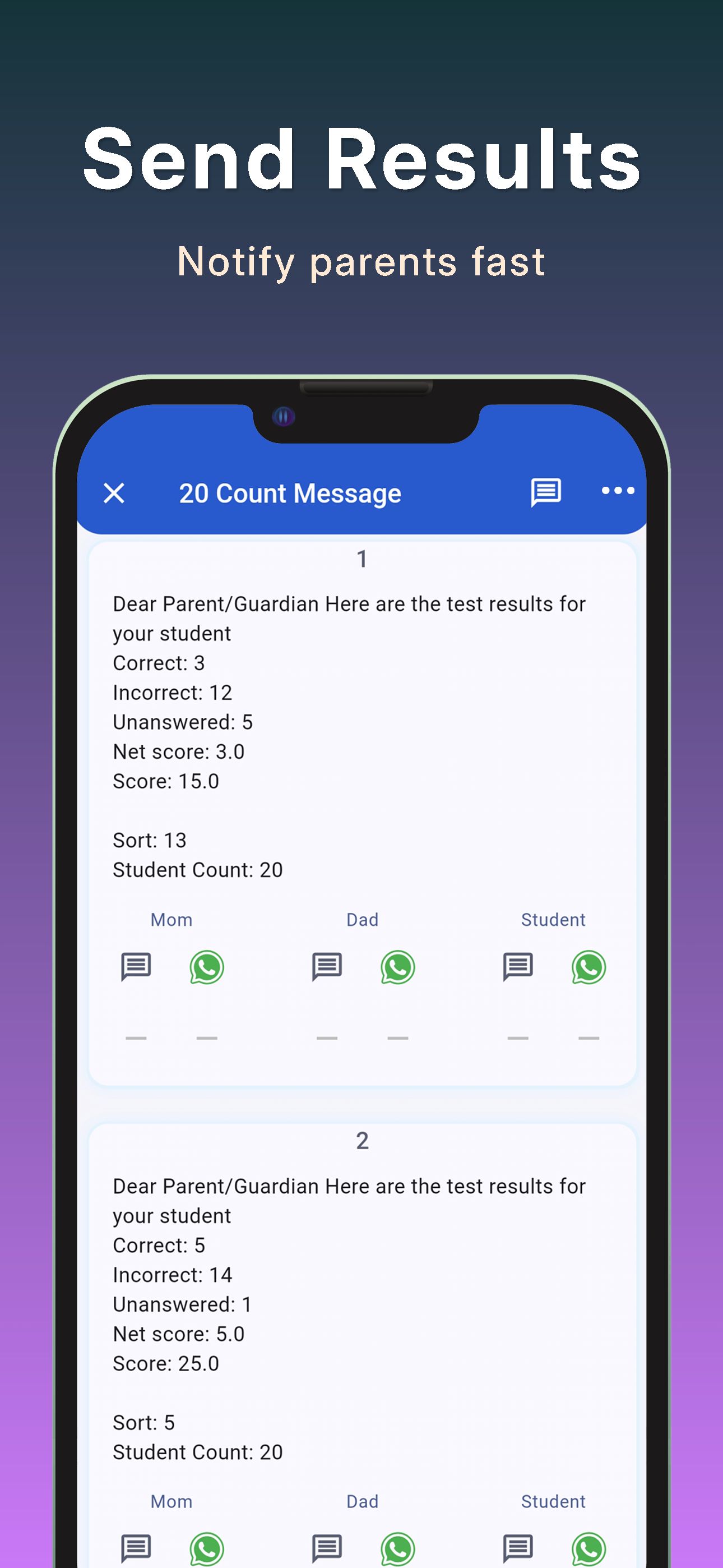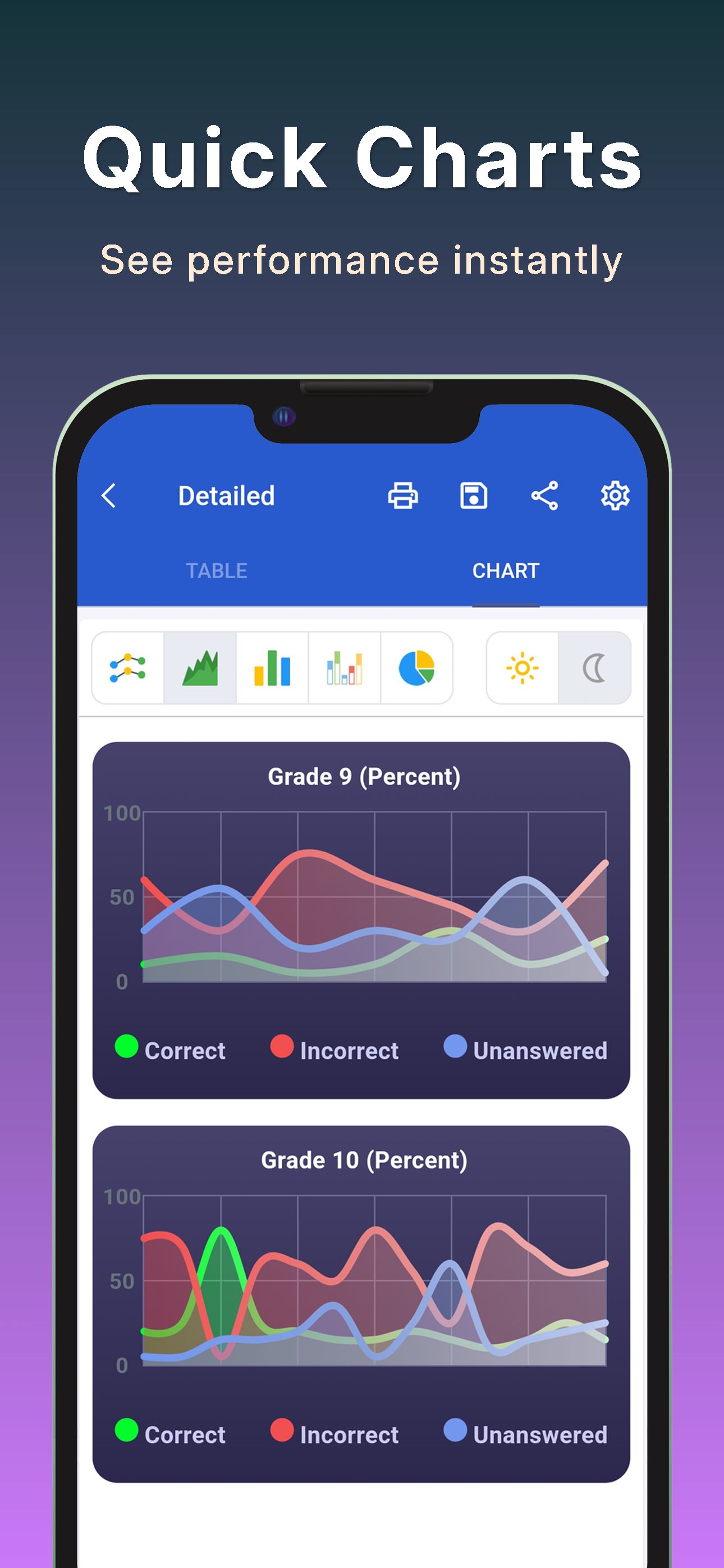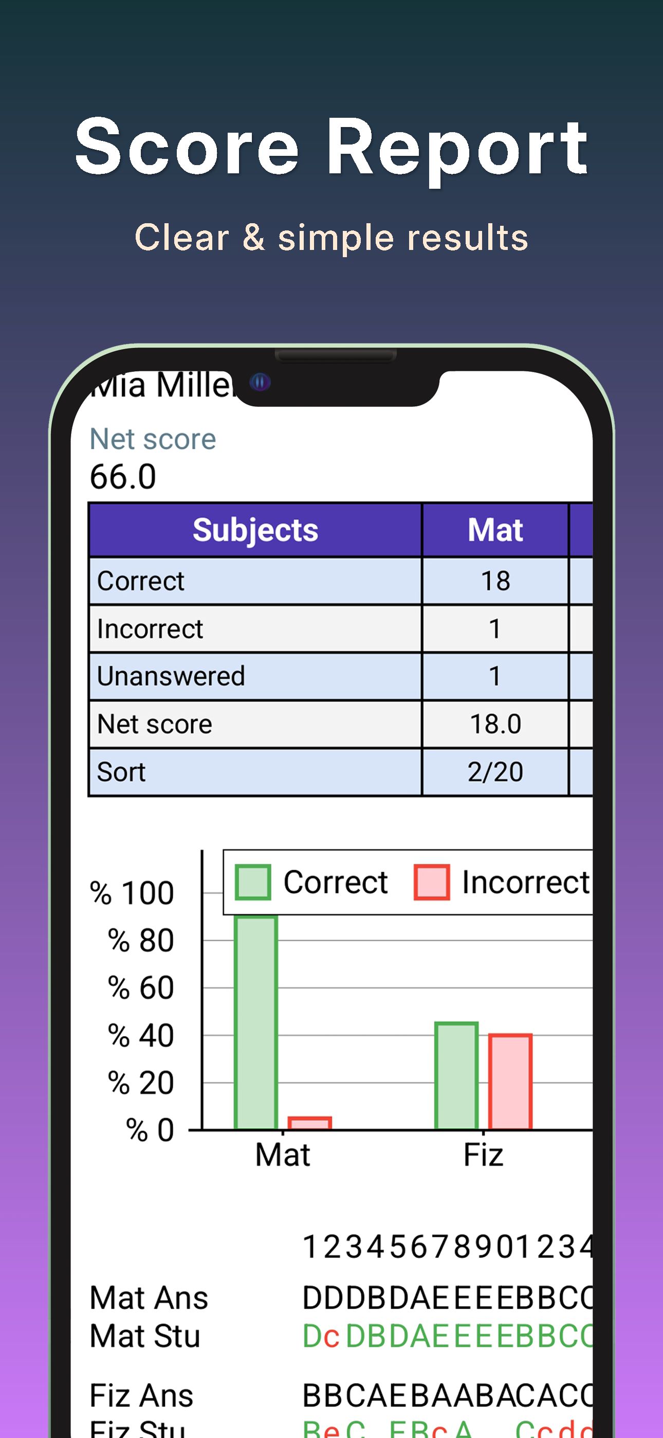 You can get detailed reports about the tests you've given and review analyses of the tests. With the app you can view statistical reports, question analyses, answer analyses, T and Z scores, and cheating analyses.